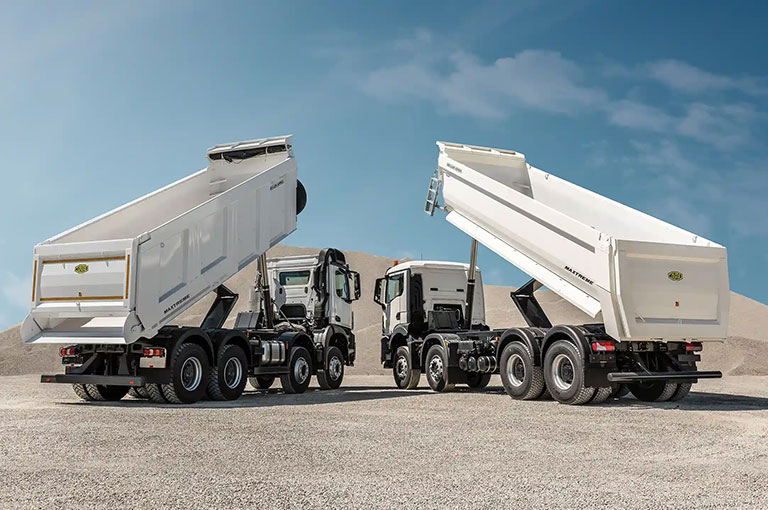 A Meiller a technológiát a kocsiszekrény és az alváz egészéhez igazítja: nem pusztán hengert ad, hanem kialakítja a csapszeghelyeket, a megerősítéseket, a billentési geometriát. Ettől válik a rendszer gyorssá és stabilná: a henger löketének hossza, a billentőpont pozíciója és az oldalfalak merevsége együtt dönti el a ciklusidőt és az üzembiztonságot.